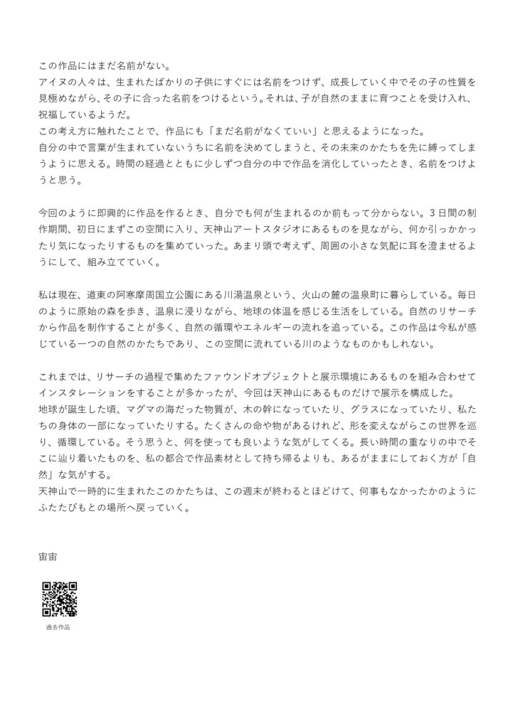 スタジオ滞在中のアーティスト 宙宙による展示を行います。