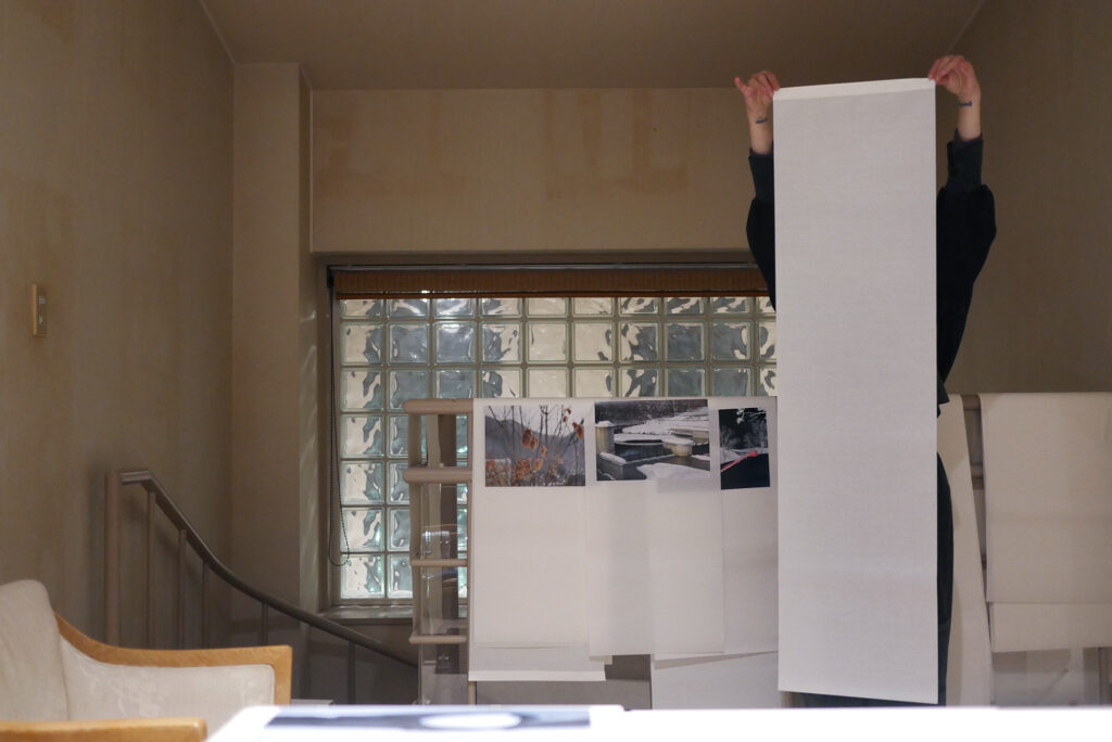 本展では、これらの写真はインスタレーションの一部として統合され、揺れ動く書道用紙に取り付けられます。それにより、雪の森の中を歩いているかのような感覚が生み出されます。紙は中立的な背景ではありません。それは雪と同じように振る舞い、空気の流れに応じて揺れ、接触の痕跡を受け取り、会期を通じて徐々に刻まれ、そして変容していきます。雪が触覚によって形づくられる暫定的な建築であるように、この紙もまた同様です。会期の終わりには、展示開始時と同じ状態ではなくなっているでしょう。