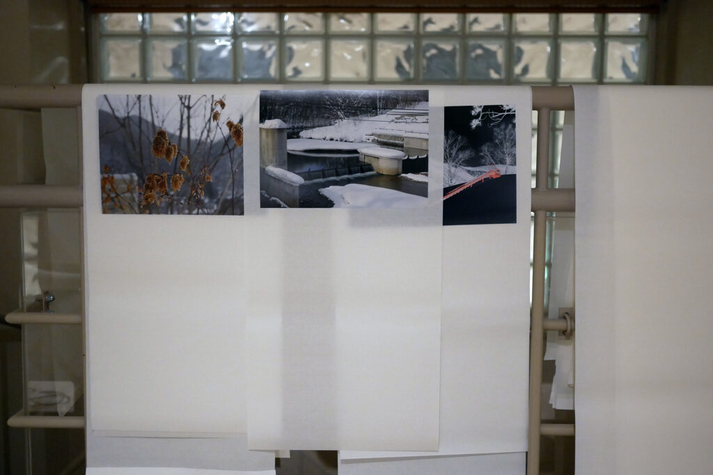 In the exhibition, these photographs will be integrated into the installation and mounted on swaying sheets of calligraphy paper to create the sensation of walking through a snowy forest. The paper is not a neutral backdrop, it behaves like snow does, shifting with air currents, taking on traces of contact, and gradually being marked and unmade over the course of the week. Snow is a provisional architecture shaped by touch, and this paper is no different. By the end of the exhibition, it won’t be what it was at the start.