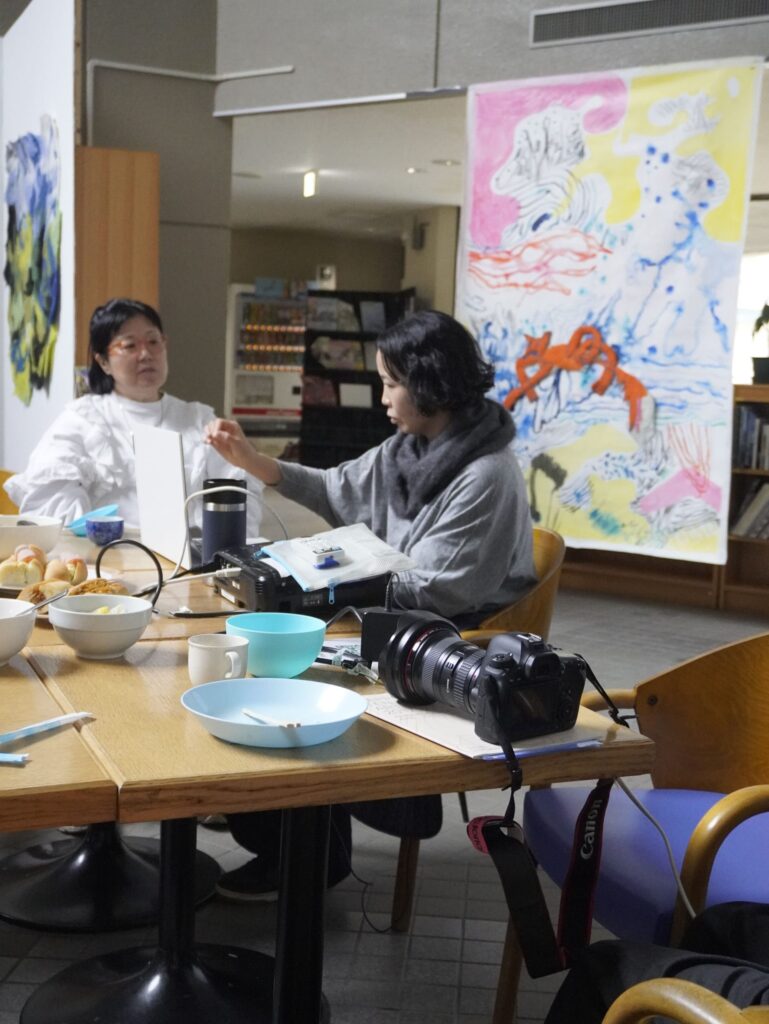今回の交流では、これまでの展覧会についても紹介していただきました。現場にある素材をそのまま活用するなど、即興性の高い手法で制作する宙宙さんにとって、「自然の情報をどれだけ自分の意識下に蓄えておけるか」がとても重要だそうです。