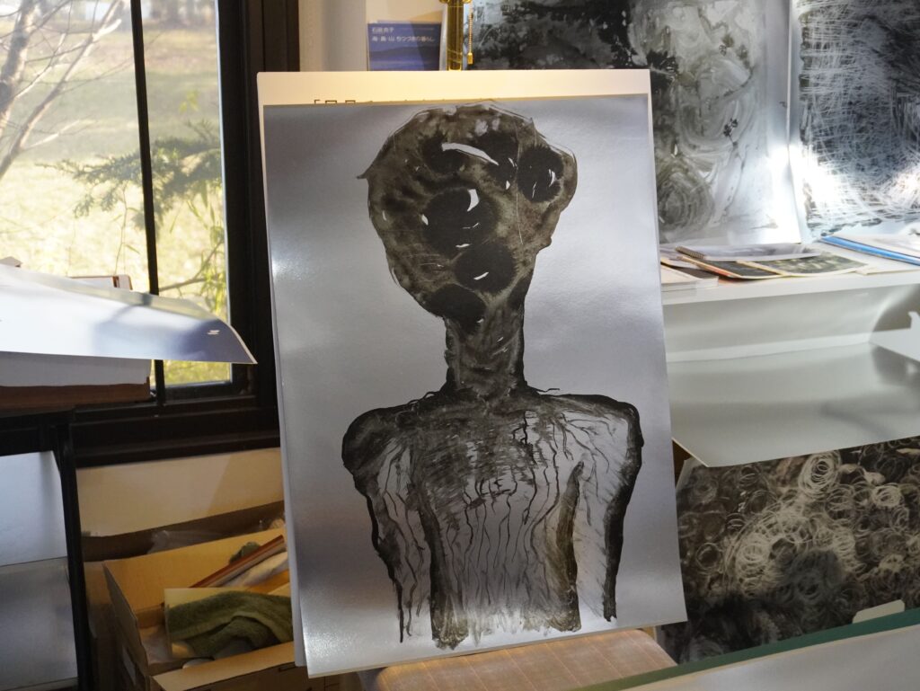 舞踏ダンサーとして舞台美術も行う明夜さんが滞在中に制作した舞踏絵を展示しました。