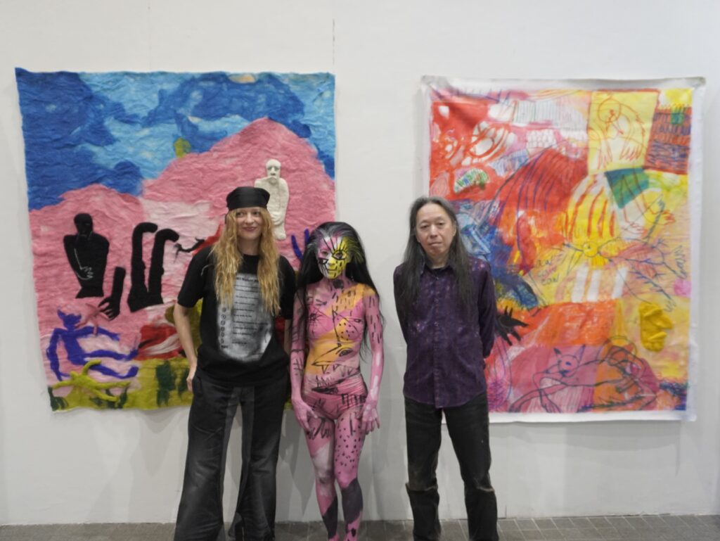 札幌を拠点に舞踏を中心に活動を行う明夜さんとオランダを拠点に絵画・タフティング・身体表現を行うユリアさんが同時期に滞在し、交流を深める中で実現するに至ったこのコラボレーションのパフォーマンス。ギャラリー犬養での明夜さんとMADZINEさんのヨーロッパ公演の報告展覧会にて、パフォーマンスの音楽を手掛けたTRANSFLUXIONさんを迎えました。