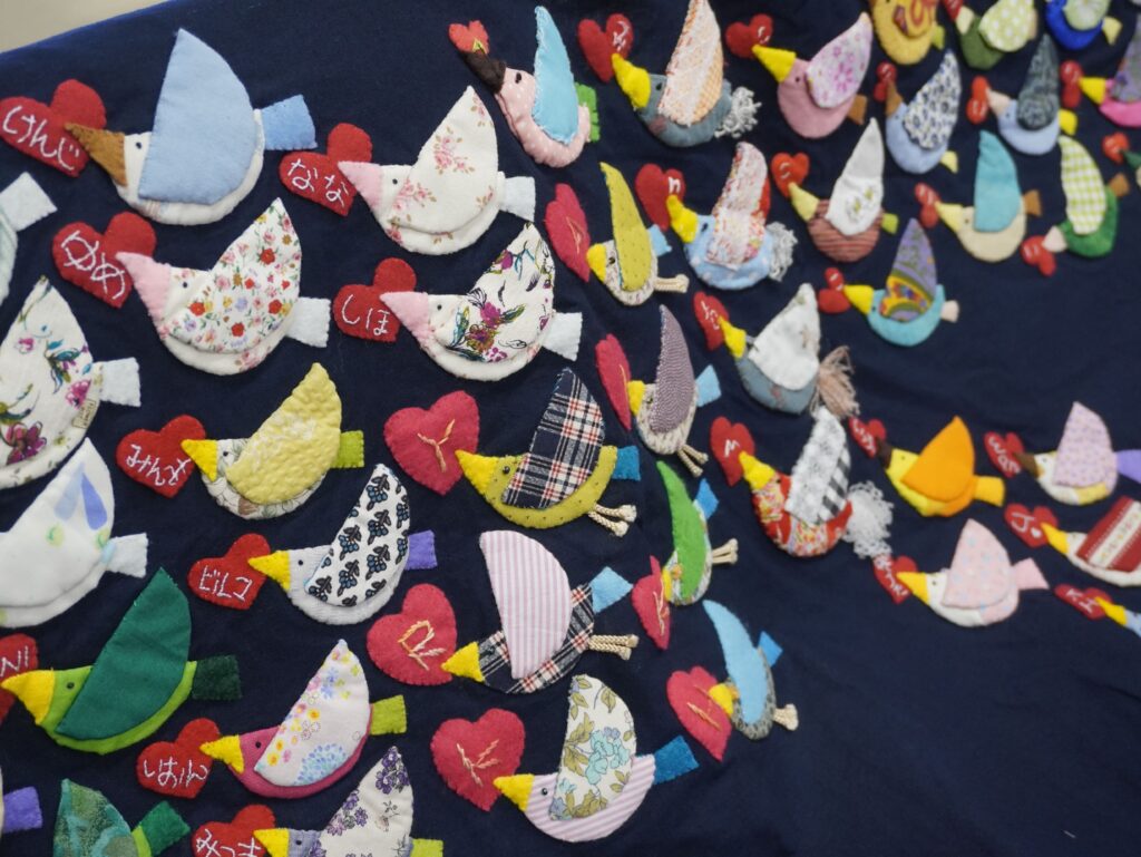 2024年8月からこつこつと進められている『1000のことり』プロジェクト。平和のシンボルである千羽鶴を布によって作り上げるとともに、参加者全員の鶴が一つの大きな布に掲げられるという「つながり」を生み出します。