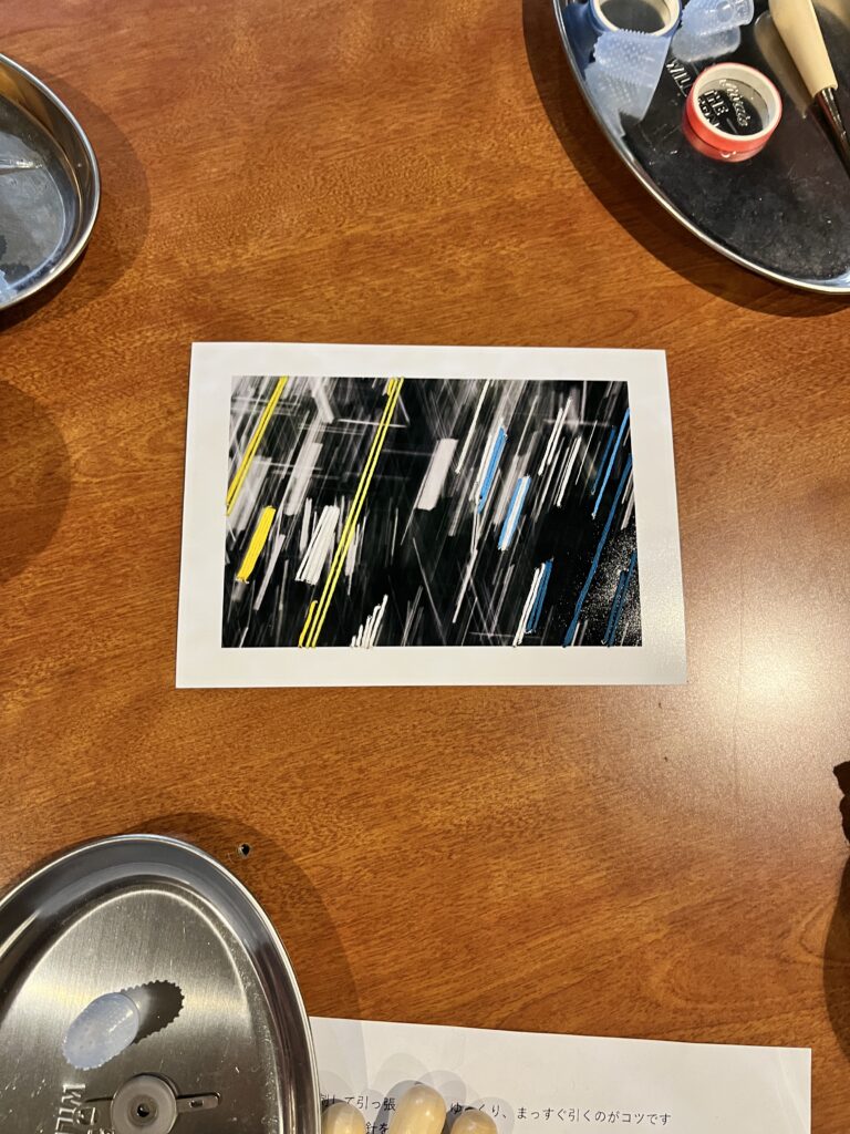 ワークショップでは、動きのある写真に糸を縫っていきます。