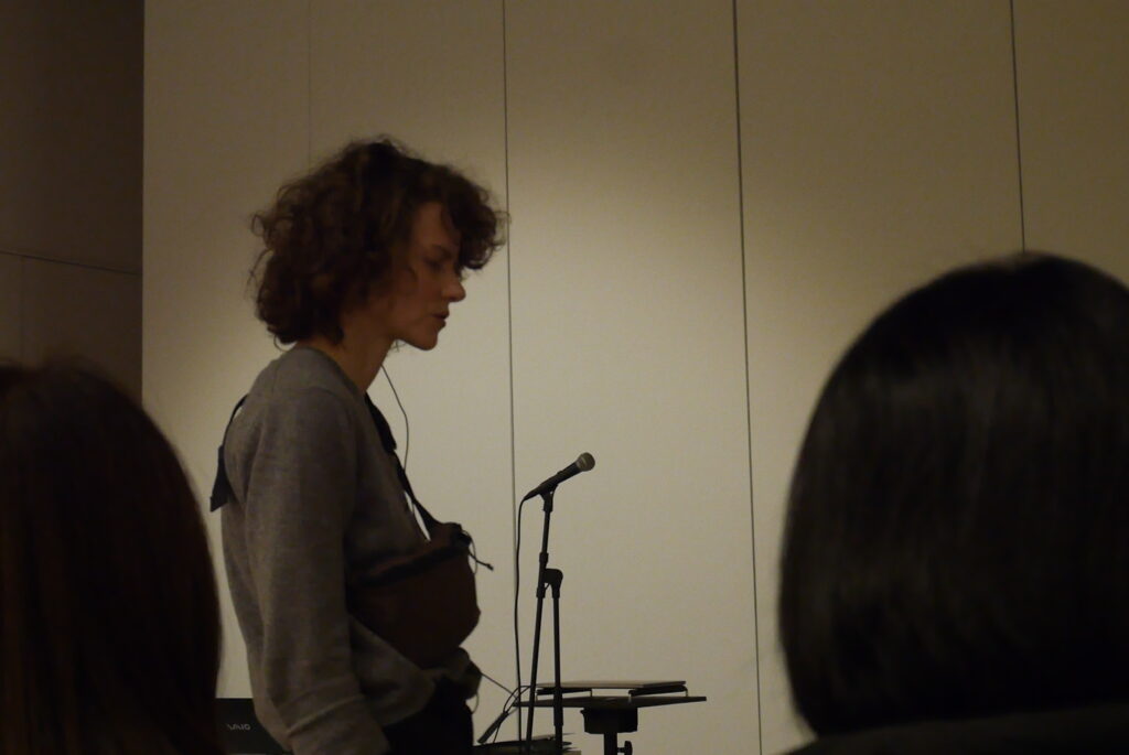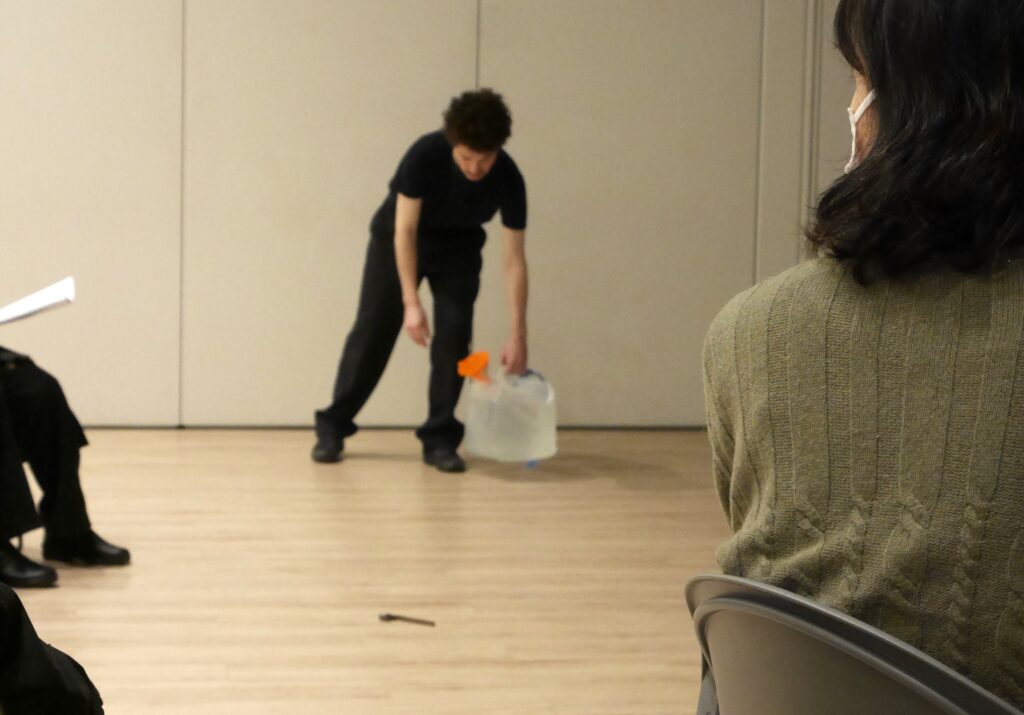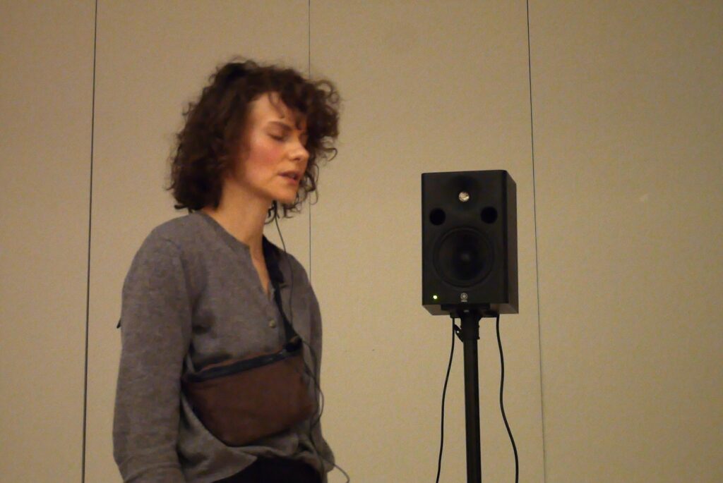小さな小さな声で暗唱が繰り返されるあいだ、iPhoneに繋がれたイヤフォンからもなにか微かに音漏れが聞こえていたのですが、微かすぎてそれがなんなのかまったくわからないくらいでした。よく考えるとグリツューテさんの暗唱も、立派な詩を載せて大衆に聞かせるなんてつもりのない、小さな音漏れみたいなものだったのでしょうか。座っている人たちは、メッセージが伝達されてこないせいで最初は「聞きたいものが聞きたいように聞こえない」という不具合に直面したかもしれませんが、時間のおかげで音声が予期せぬ形でまとまりをみせていったところは、確かに出産育児という経験の根本的な予測不能さと通じる気がします。