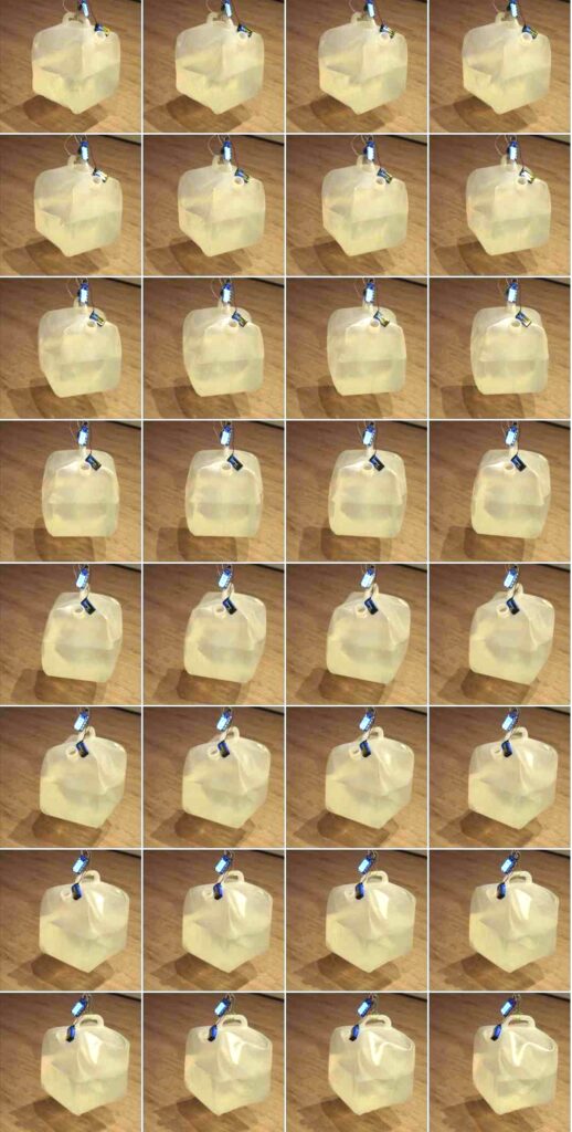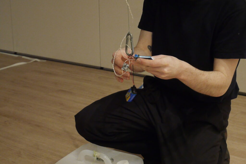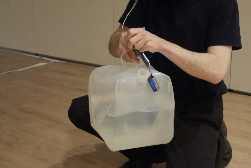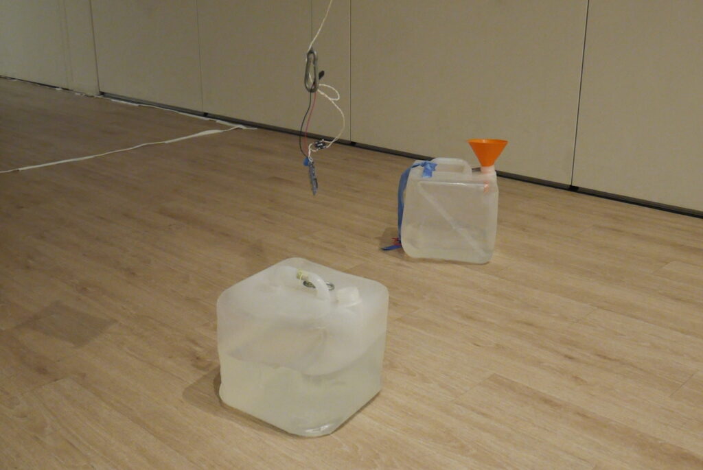 Gurinas first sets up the milky-white tanks scattered throughout the room. He attaches a jangling assortment of everyday items—piece of paper, wood, carabiners, strings, clips—all commonly found in DIY projects or home kitchens. The artist suspends them from the ceiling and uses an orange funnel-equipped tank to pour a clear liquid into the tanks. After adjusting the liquid levels and such, he sets the timer-like devices tangled in the carabiners and strings, completing the setup for that tank. Gurinas then moves on to the next one. Between tank setups, he pulls out spring-loaded, creaking, insect-like items and places them sparingly on the floor, gradually filling the space with a faint, buzzing noise.