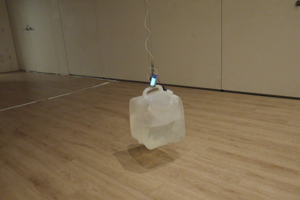 By the time all tank setups are complete, the venue grows slightly quieter, revealing a low electronic hum emanating from the jangling parts connecting the tanks to their suspension cords. The sound from each individual tank is small and doesn’t resonate, but it seems to gain presence when combined. After that, Gurinas busily walks from tank to tank, swinging them like Tarzan ropes, rotating them around the suspension ropes, and carefully adjusting the jangly parts. Gradually, electronic sounds and the chirping of the creaky bug-like parts start coming from all directions. It gives the audience a sense that’s incredibly expansive. Though the space was composed of crafty objects, the sound possessed a texture non-native to our daily life, bursting in from multiple directions. Tanks, which should have been heavy and solid, were strangely full of vitality and it was good.