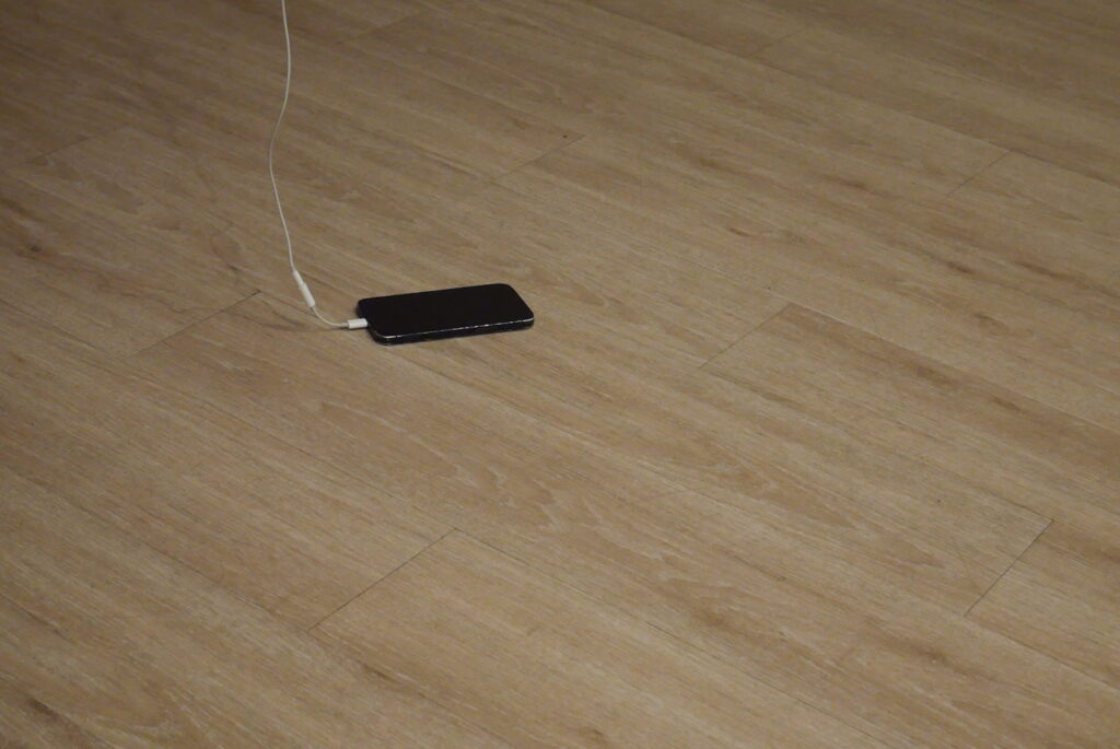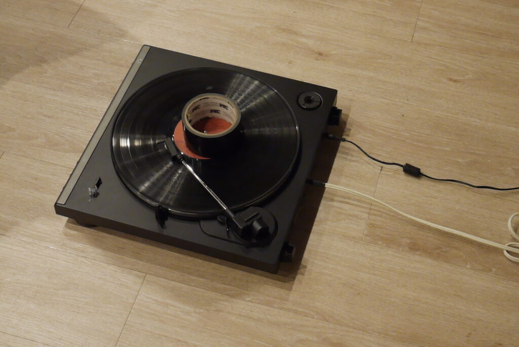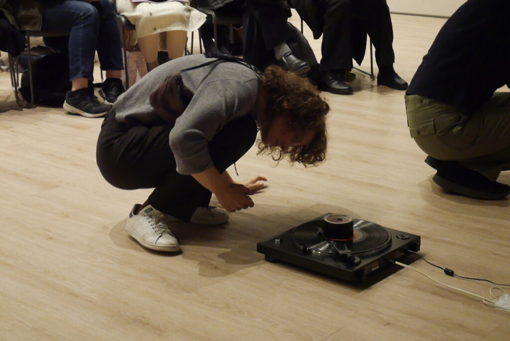 With Gurinas’ assistance, Gailė Griciūtė began setting up a turntable set, suspending iPhones around from the ceiling. As the lights dimmed and a steady rhythmic ticking began, the venue instantly fell silent. Then, in a voice too low even for the microphone to catch, Griciūtė began reciting a poem in English.