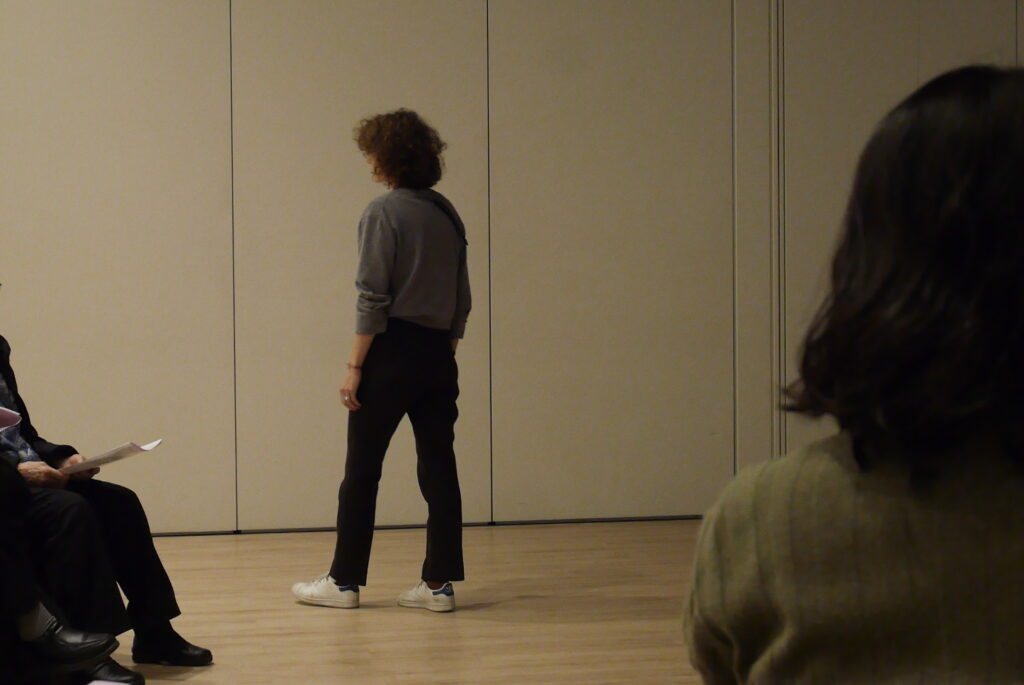 While the recitation repeated in a voice that’s soft and low, some sound was faintly leaking from the earphones connected to the iPhone. It was so faint I couldn’t tell what it was at all. Throwing back, perhaps  Griciūtė’s recitation was also like that slight sound leakage—not intended to present a grand poetry to the mass audiences. Those seated might have initially faced the glitch of “not hearing what they wanted to hear the way they wanted” because the message wasn’t being conveyed. Yet, over time, the sound unexpectedly came together in different unexpected forms. This certainly resonates with the fundamental unpredictability of the experience of childbirth and child-rearing.
