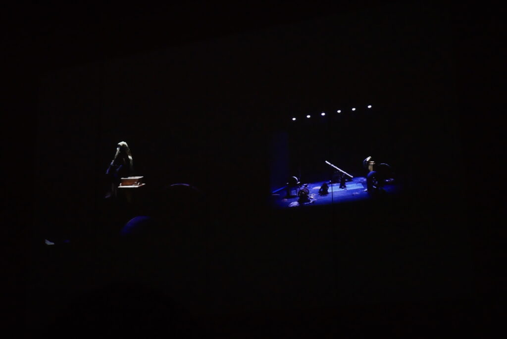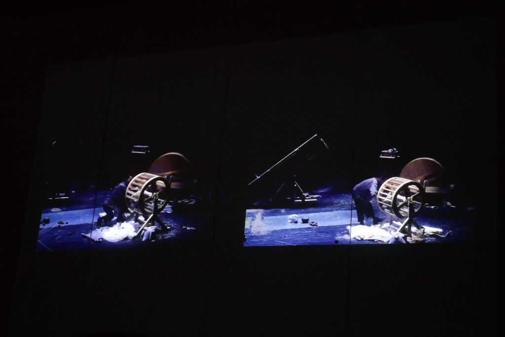 The kinetic sound devices moving across the stage are gigantic, and gradually you can sense the fatigue of the people moving them with all their strength. It begins to look as if the people are being pushed and pulled by the devices. It won’t take so long to see humans replace the sound devices in the audience’s priority in cognitions. The analytical ability to discern the movements of human bodies and the grandeur of space within the gaps of the technical cliché of the rustic apparatus, coined with the unique approach of developing the sound instruments into performance and video works. In all that I sensed the masterful skill of Bumšteinas.