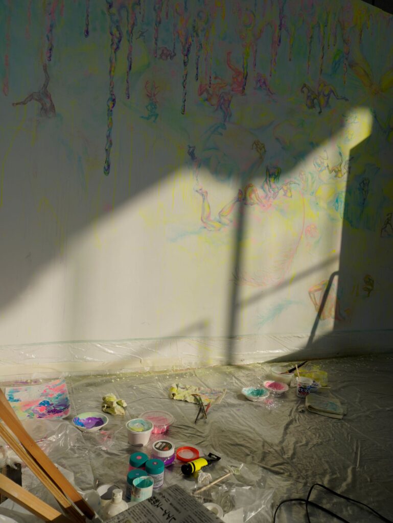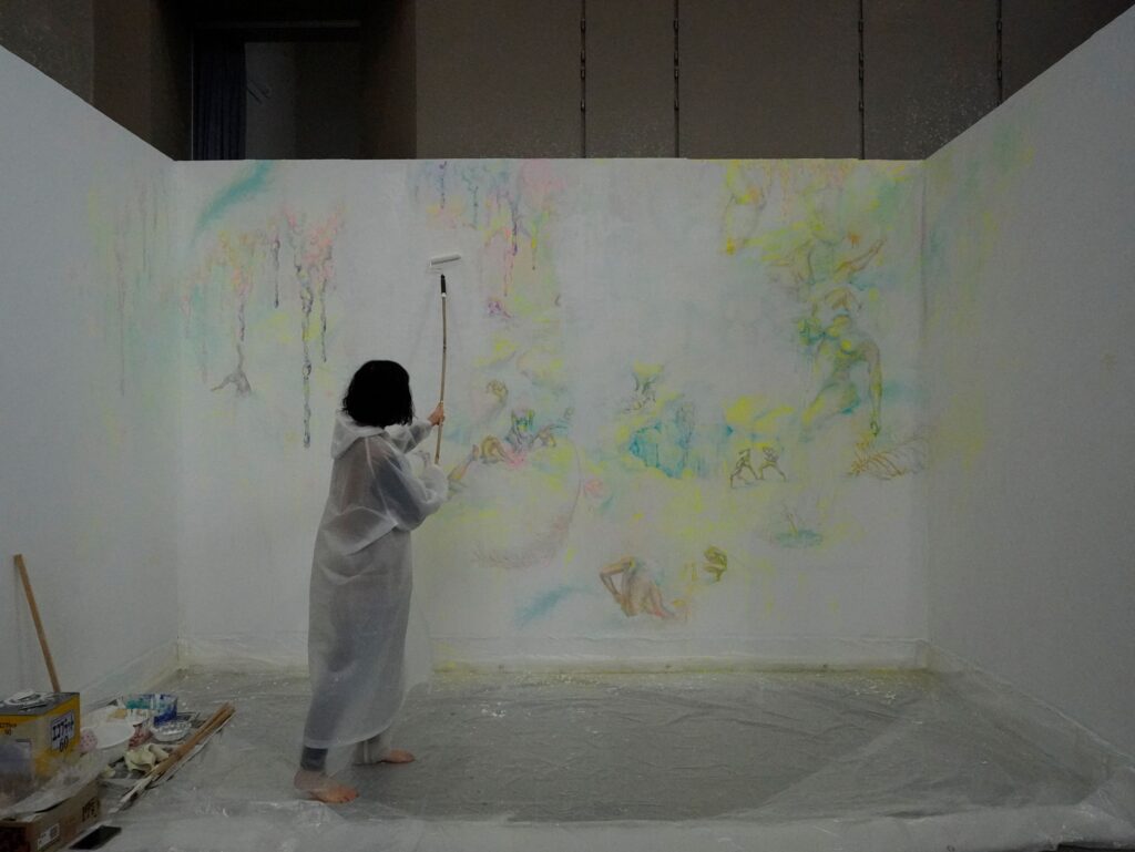 一週間にわたって公開制作を行い、展示壁いっぱいにペインティングを施していた キム・ソヨン、その作品【雪まつり】を、なんと自ら消してしまう——というパフォーマンスを行いました。