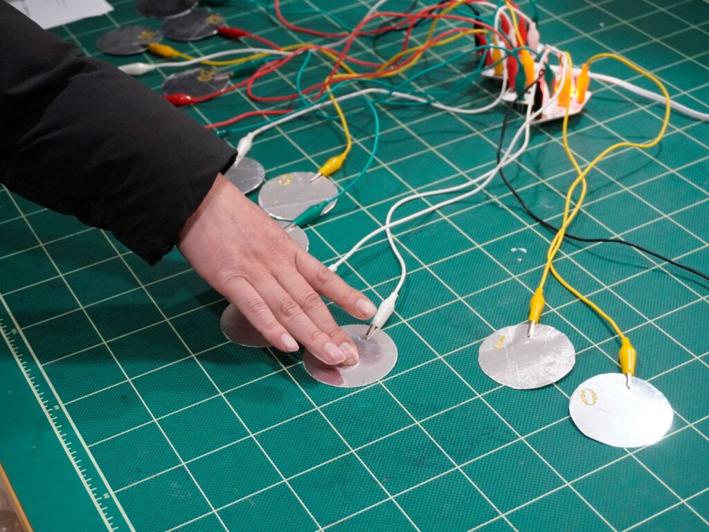 参加者は、二枚の紙に触れることで音が鳴るサウンド装置を体験しながら、「これは何の音だろう?」と想像をめぐらせます。カサカサ、パリパリ、ガサッという微細な音が、プラスチックなのか、紙なのか、あるいは別の素材なのか——耳を澄ませることで、普段は意識しない廃棄物の存在が立ち上がってきます。